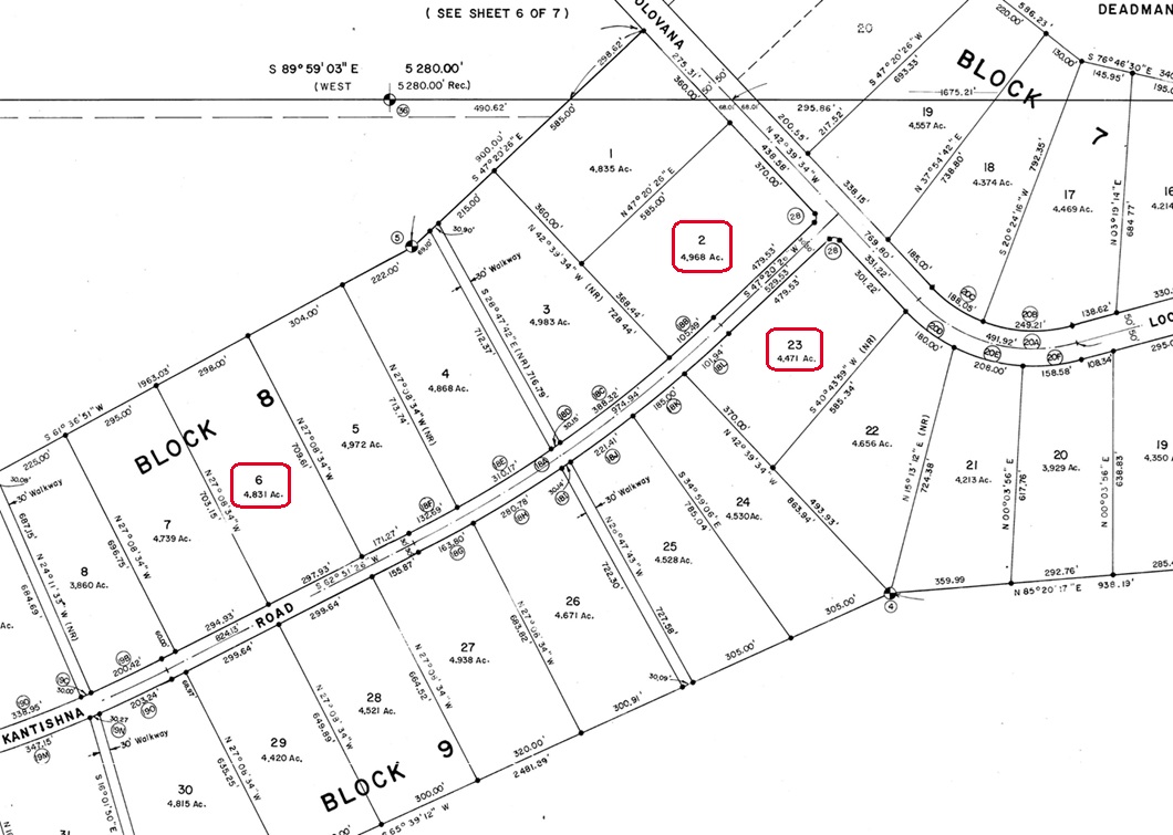 Legal Description: Lots 2 & 6 Block 8 and Lot 23 Block 9 Deadman Lake Subd.; ASLS #81-40; Manley Hot Springs Recording District; Plat #81-6
