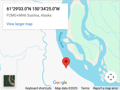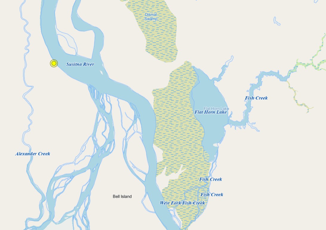 Directions: Located on west bank of Susitna River between Alexander Creek & Flat Horn Lake; see maps.